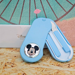 - Juego de cuchara, tenedor y estuche con Mickey Mouse en Plata.