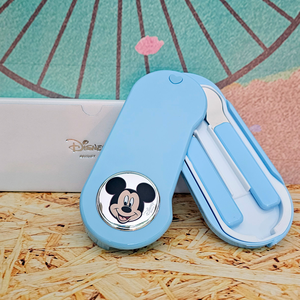 - Cubiertos de acero y plástico, para que los peques empiecen a independizarse a la hora de la comida con sus propios cubiertos. En estuche de plástico con aplicación de plata laminada esmaltada de Mickey Mouse.