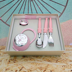 - Set de cubiertos, porta chupa y sujeta chupete fabricado en plástico hipoalergénico rosa con bilaminado de plata esmaltado en color.