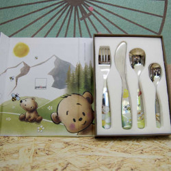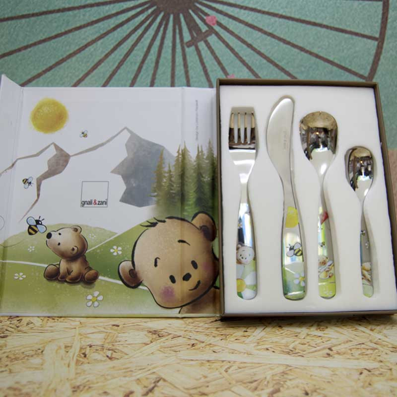 - Conjunto de cubertería infantil en acero, con dibujos de Osos en color.