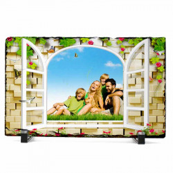 - En este diseño podrás poner tu fotografía favorita en el hueco de la ventana. La impresión en pizarra es de alta calidad, pues imprimimos con las ultimas tecnologías a todo color de esa manera obtendrás un portafotos pizarra muy original y de gran calidad.